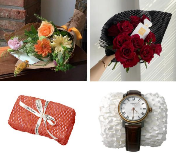 Depending on the use of the scenario, the wrapped items can be matched with different colours, for example, wood-coloured honeycomb paper wrapped with appliances, food, etc. represents nature. Red honeycomb paper wrapped with chocolate and cosmetics represents love and passion. White honeycomb paper wrapped with daily necessities represents cleanliness. Black honeycomb paper wrapped with high luxury items represents nobility and adds cushioning as well as value.